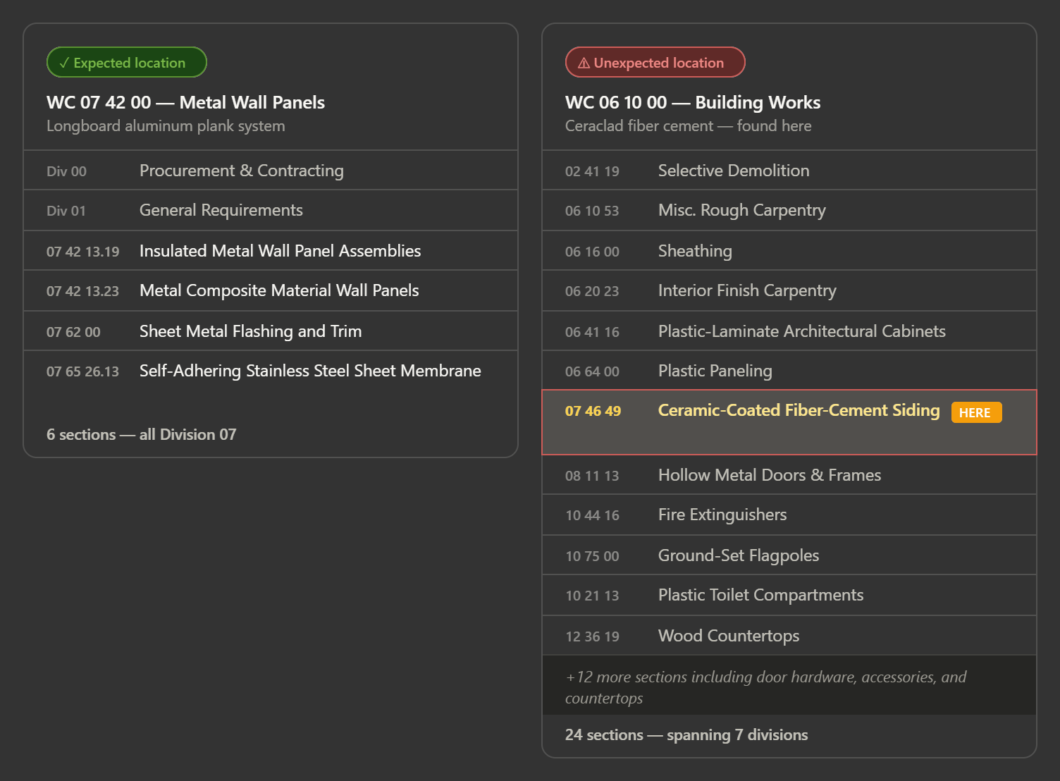 Finding 07 46 49 buried in a Building Works catch-all is one problem. Knowing the GC needs that product priced separately from the metal panel scope is a different problem altogether. Price them combined on the metal panel bid form and the number becomes unreadable during leveling. The GC cannot use it.